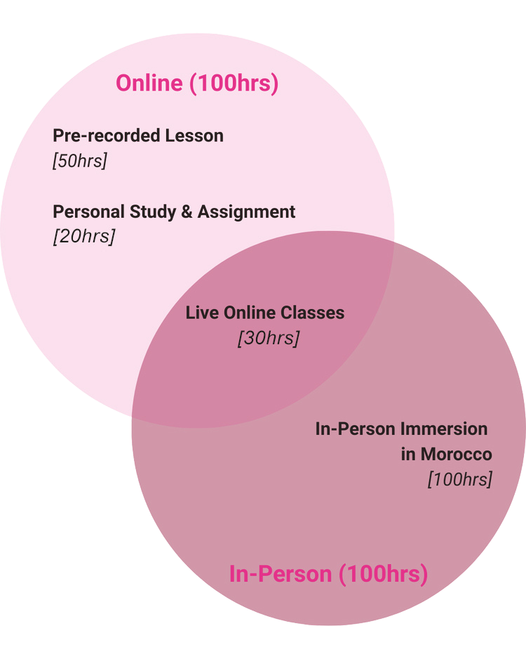 Our Hybrid 200hr YTT is designed for people who want the depth and transformation of in-person training, while integrating study into daily life. You begin online with guided modules and live reflections, then come together for a powerful in-person immersion in Bali or Morocco.